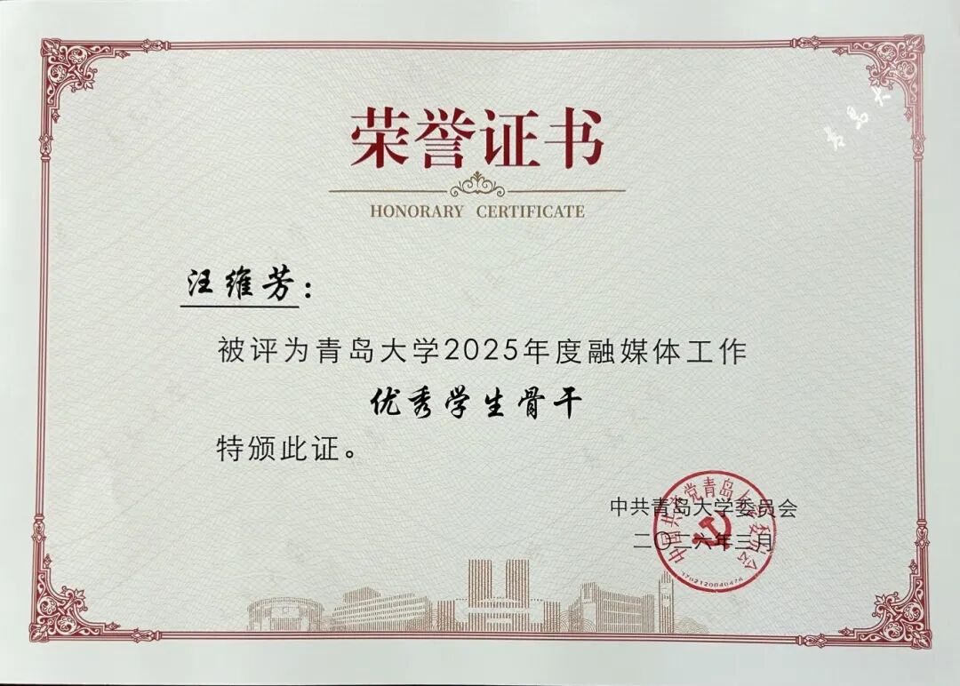 艾提排·穆合塔尔、汪维芳两位同学荣获“2025年度融媒体工作优秀学生骨干”称号。全程参与、从不懈怠,主动担当、积极作为,两位同学以饱满的热情与扎实的工作能力,圆满完成了各项工作任务,展现出学生骨干在51吃瓜媒体建设中的重要作用与青春风采。