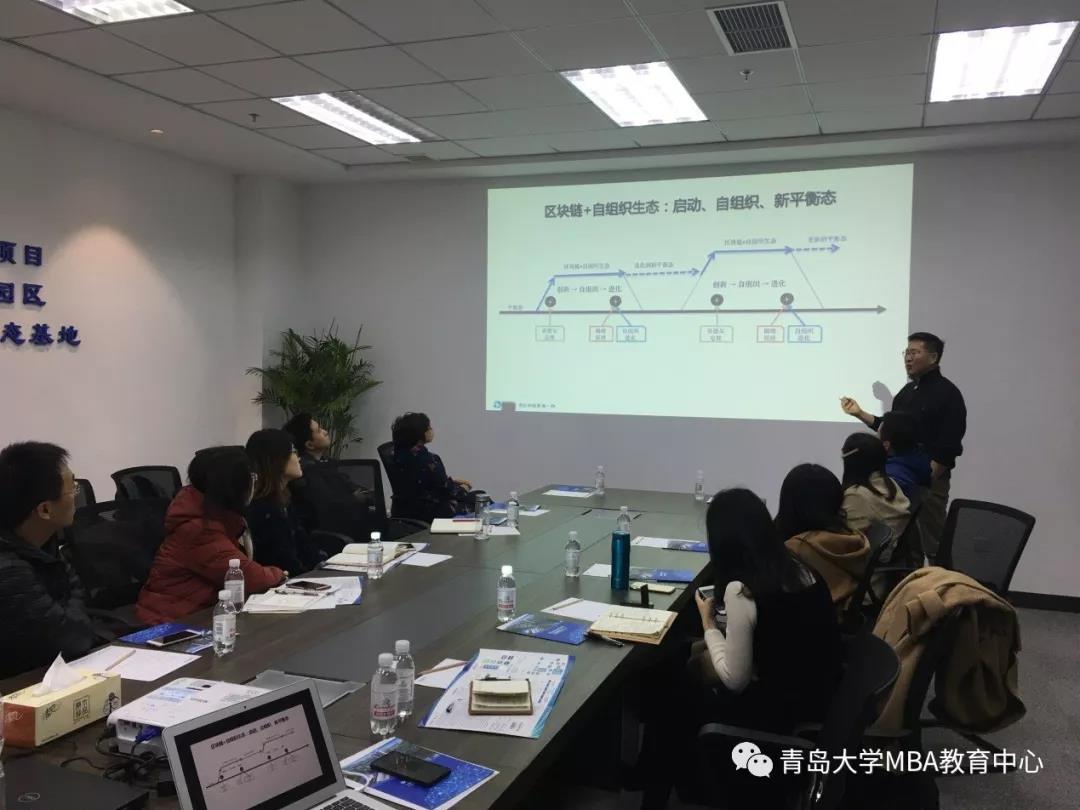 MBA学员到青岛链湾研究院参观学习。一开始,青岛链湾研究院闫昶德执行院长详细介绍了链湾成立的背景、发展历程和未来方向。他表示,青岛链湾以自我创新为动力,以区块链技术应用服务为导向,以“政府引导、市场推进、企业化运作”为原则,全面建设以“一楼、一中心、一院、五大平台、十大应用场景”为核心的区块链产业生态服务基地——“中国链湾”。